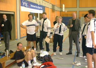 Vom Spiel der 5. in Wachtberg ist der Redaktion nur das Ergebnis bekannt, ein aus der Ferne sehr erstaunlicher 5:3-Sieg, der auch in der Tabelle weiterhilft. Ziel für das 5. Team kann nur sein (anders als in der vergangenen Saison), möglichst früh die zum Klassenerhalt nötigen 12 Punkte zu sammeln und dann in Ruhe zu schauen, was möglich ist. Mit erneut optimaler Punktausbeute der Damen legte die 6. den Grundstock für ein überraschendes Unentschieden beim 1. BC Beuel 7. Karen Tozer, die ihren Mann auf der Reise nach Deutschland begleitet hatte, spielte ihr erstes Match für den TuS 05 und Mixedpartner Lemmi war begeistert . Die alte Weisheit, dass selbst ältere englische Ladies in rosa Plüschhosen, bei denen man befürchten muss, dass ihnen beim Pantersprung ans Netz das Gebiss fliegen geht, im Mixed gefährlicher sind als 90% ihrer deutschen Kolleginnen, bewahrheitete sich einmal mehr. schmetter-ball.de stuft unsere Karens (auch die Frau des Autoverkäufers) natürlich nicht in die Kategorie älter" ein, sondern möchte nur ihre offenbar angeborenen Mixedqualitäten unterstreichen. Den 4. Punkt holte Jürgen Rux im 1. Herreneinzel. Weiter auf die ersten Punkte muss die 8. Mannschaft warten, beim 3:5 gegen Sankt Augustin 2 hatte am ehesten noch das DD Noske/Berres die Chance, den 4. Punkt zu holen, verlor aber knapp im 3. Satz. Überraschend spielfreudig zeigte sich Webmaster Tom, der das Doppel (mit Zipf) und das Einzel gewann. schmetter-ball.de vermutet, dass Toms frühe Anreise (über 2 Stunden vor Spielbeginn) hier ausschlaggebend war. Daggi Noske/Jo Frings steuerten den 3. Sieg bei. Junioren - Alle Teams weiterhin unbesiegt Nur Martin Dahm verlor sein Einzel beim 7:1 der Jugend in Brühl. Für die noch verletzte Vanessa Karper sprang (wie selbstverständlich) Heike Schröder ein und machte ihre Sache sehr gut. Auch die Formkurve von Anne Weyler zeigt seit einigen Wochen nach oben. Tabelle: Platz 2. Mit P. Jäger und H. Hoffmann fehlten in der Schülermannschaft wichtige Leistungsträger, trotzdem konnte das Team in Rheinbach mit 6:2 gewinnen. Tabelle: Platz 1, punktgleich mit 1. BC Beuel. Die Einsteiger mussten in Rheidt antreten und brachten einen 5:1-Sieg mit nach Hause (Klar abgezogen" sprach Begleiterin Monivize). Tabelle: Platz 1 (hier ist die Tabelle bei milon.de falsch!). Bisherige Saisonbilanz unserer Mannschaften - Stand: 01.10.01 39 Spiele 26 Siege 6 Unentschieden 7 Niederlagen | |||||||||||||||||||||||||||||||||||||||||||||||||||||||||||||||||||||