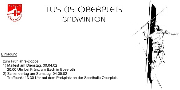 Info zu 1) Wolltest Du nicht schon seit längerem eine romantische Nacht am Lagerfeuer verbringen? Gelegenheit dazu bietet das 14. Maifest für Federballer und Freunde am lauschigen Lützbach. Getränke stehen, wie beim Herbstfest, zum Verkauf zur Verfügung. Pauschalzahlungen werden gerne entgegengenommen, aber natürlich gibt es auch Einzelverkäufe. Dass frische Luft in Verbindung mit fließenden Gewässern hungrig macht, weiß jeder. Gelegenheiten zum Grillen sind darum vorhanden. Dabei werden die Gerichte exakt nach Deinen Wünschen vom besten Koch der Welt zubereitet, nämlich von Dir selbst. Jeder versorgt sich also selbst und bringt mit, was er verzehren möchte. Auf anliegenden Wiesen stehen allerdings auch Gras und Löwenzahn in ausreichenden Mengen zur Verfügung. Empfehlenswert für bequemes Sitzen am Feuer ist schließlich das Mitbringen eines Campingstuhles. Info zu 2) Nach mehrjähriger Pause wird (wegen steigender Nachfrage) wieder ein Schlendertag für Federballer und Freunde stattfinden. Da wir die nahe Umgebung schon abgeklappert haben, ist zunächst ein etwa 20-minütiger PKW-Transfer ab dem Treffpunkt (s.o.) zum Ausgangspunkt der Schlenderung nötig. Chauffeure dazu besorgt die Schlenderkommission. Die Schlenderstrecke wird in 2 Teilabschnitten, einem ersten von ca. 1 ½ Stunden und einem zweiten von ca. 1 Stunde, absolviert. Dazwischen findet eine ca. 1-stündige Rast statt und am Endpunkt der Strecke wird ebenfalls eine längere Pause in einem Rasthaus eingelegt. In beiden Rasthäusern gibt es die Gelegenheit, etwas zu essen oder zu trinken. Mit Bahn und Bus geht es anschließend zurück nach Oberpleis. Ankunft in Oberpleis am Busbahnhof ist um 19.42 Uhr. Zu den Fahrtkosten gibt es für jeden Teilnehmer einen Zuschuss von der Abteilung. Trotzdem sollte man, auch für den Verzehr in den Rasthäusern, etwas Kleingeld einstecken. Wenn jemand nicht von Anfang an mitmachen kann, so besteht die Gelegenheit, später zur Schlendergesellschaft zu stoßen (z.B. um 15.30 Uhr im 1. Gasthaus). Wegen der strikten Geheimhaltung des Reisezieles kann erst nach dem Abmarsch, ab 14.05 Uhr, bei Marie unterwegs (0171-7017502) die Route abgefragt werden. Eine Bitte zu 1) und 2) (auch wenn es lästig erscheint): Es ist unbedingt erforderlich, sich zu beiden Terminen (rechtzeitig) anzumelden, ansonsten kann nicht seriös geplant werden. Anmeldungen zu beiden Veranstaltungen sind auf allen denkbaren Wegen an Moni und den Chief möglich, persönlich, telefonisch (Moni 02244-7093, Chief 02244-4861) oder per E-Mail (moni@schmetter-ball.de, chief@schmetter-ball.de). Chief | |||||||||||||||||||||||||||||||||||||||||||||||||||||||||||||||||||||