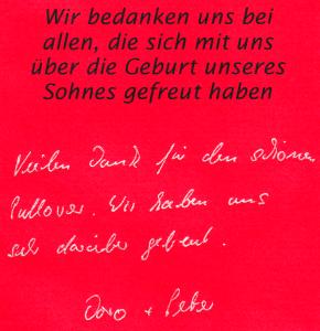 Nils Koch 09.05.02 Nils Koch (5 Monate) bedankt sich bei der Abteilung für die Glückwünsche zu seiner Geburt und schickt dazu ein Jugendbild, dass ihn im Alter von 2 Monaten zeigt. Mittlerweile hat er sich einen Vollbart stehen lassen. |