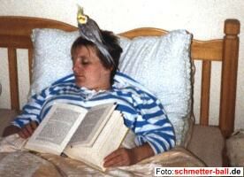 Bilder für schmetter-ball.de 02.05.02 Der Aufruf der Redaktion, Bilder zur Veröffentlichung zur Verfügung zu stellen, wurde, wie nicht anders zu erwarten, zu einem Schuss in den Ofen, denn es gingen keinerlei (null) Antworten ein. Deshalb noch einmal eine Ermunterung und ein weiteres Beispiel: Marie und Bimbo, der später verstarb, weil er zu viel Bonnezupp" vom Teller seines Hausherrn genascht hatte, eine Nahrungsquelle, die im genetischen Bauplan von Nymphensittichen vermutlich nicht vorgesehen ist. | ||||||||||||||||||||||||||||||||||||||||||||||||||||||||||||||||||||