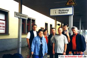 8. Team on Tour 20.06.02 Die diesjährige Mannschaftstour ging per Zug nach Rüdesheim. Ausgedehnte Wanderungen, kulturelle Sehenswürdigkeiten, kulinarische Köstlichkeiten sowie ein Besuch der Drosselgasse standen auf dem Programm. Mehr Bilder finden Sie hier. 8. Team bei der Abreise v.l.n.r. Jo, Britti, Daggi, Tom, Mattes, Jan, Mike | ||||||||||||||||||||||||||||||||||||||||||||||||||||||||||||||||||||