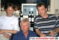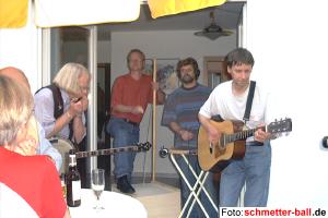 Mit dem Vorhängeschloss auf Du und Du... 10.07.02 ...befinden sich offensichtlich längst nicht alle Abteilungsmitglieder. Einige sind nach dem Training sogar so ausgepowert, dass sie selbst kleinste Bewegungen mit Daumen und Zeigefinger (sprich: das Zuklicken von 2 Vorhängeschlössern am Schrank und am Gestell für die Netzpfosten) nicht mehr auf die Reihe bekommen. Ergebnis: Mitbenutzung unserer Netze und Pfosten durch andere, Materialverluste und ein heilloses Durcheinander. Eine Abwanderung des feuerroten Wanzenschnellspanners zu neuen Besitzern ist bei diesen Zuständen nur eine Frage der Zeit. schmetter-ball.de appelliert erneut an alle Abteilungsmitglieder, mitzuhelfen und aufzupassen, dass nach jedem Training Netze und Pfosten aufgeräumt und die beiden Schlösser zugedrückt werden. Rauschendorfer Band begann Welttournee in Oberpleis 10.07.02 Die Rauschendorfer Waschbrett-Band mit dem Namen "Rauschendorfer Philharmoniker" begann ihre lang geplante Welttournee in Oberpleis, In der Rosenau, wo sie anlässlich der Geburtstagsfeier des Chiefs aufspielte und vom Publikum mit stehenden Ovationen verabschiedet wurde. Bindeglied der Band zu Badminton-Abteilung, Vorstand, Club MFL und schmetter-ball.de ist Multitalent Eero Mattila, der innerhalb der Gruppe für Gitarrenspiel und Gesang verantwortlich zeichnet. Die weiteren Bandmitglieder sind: Wolfgang Schonert (Banjo, Mundharmonika und Gesang), Jürgen Klute (Kistenbass) und Uwe Korte (Waschbrett). | |||||||||||||||||||||||||||||||||||||||||||||||||||||||||||||||||||||