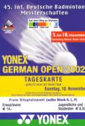 schmetter-ball.de verschenkt Freikarte 13.09.02 Für den Finaltag der diesjährigen German Open in Duisburg-Rheinhausen (Sonntag, 10. November) verschenkt schmetter-ball.de eine Freikarte im Wert von 14. Der erste Interessent, der sich bei redaktion@schmetter-ball.de meldet, bekommt die Karte in der nächsten Woche ausgehändigt. Für alle, die sich ihre Karte nicht selber besorgen wollen, bietet schmetter-ball.de einen zentralen Karteneinkauf für die Viertelfinalspiele am Freitag 8. November an. Die Veranstaltung beginnt wie im Vorjahr um 14:00 Uhr. Bestellungen bitte ebenfalls an redaktion@schmetter-ball.de. | |||||||||||||||||||||||||||||||||||||||||||||||||||||||||||||||||||||