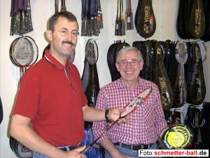 | Harald Klauer (links) und sein Mitarbeiter, die Badmintonlegende Albert Dreckmann (rechts) | Der neue Laden in Pützchen | ||||||||||||||||||||||||||||||||||||||||||||||||||||||||||||||||||||