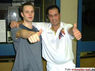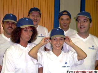 | Das 4. Team ist weiter auf dem Vormarsch. Die Gästemannschaft aus Weilerswist machte zwar keine Geschenke, die Damen Anja Fischer und Gaby Kalt mussten ebenso in den 3. Satz wie die Herren Bu Lorscheid und Heinz Schneider. Dennoch stand am Ende ein klares 7:1 auf dem Spielberichtsblock. Die einzige Niederlage strich Bu im 1. Einzel ein, nicht weil er schlechter war als sein Gegner, der ehemalige Friesdorfer Osmialowski, sondern weil er sich schon vor Spielbeginn einredete, er könne gegen diesen Defensivkünstler nicht gewinnen, und so kam es dann auch. Das Team lief übrigens erstmalig in den von Gallone Falkus' portugiesischer Firma PLANOTIR gesponserten Trikots auf. |