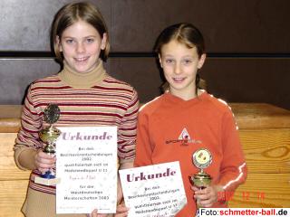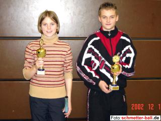 Lisa Kaminski herausragend bei den Bezirksmeisterschaften der Junioren Auch Stefan Lemke und Alina Pohl qualifiziert für die Westdeutschen Meisterschaften U13 19.12.02 Wie gut Lisa Kaminski geworden ist, wissen ihre Gegnerinnen spätestens seit dem letzen Sonntag. Bei den Bezirksmeisterschaften der Junioren U13 U19 in Refrath ging sie in drei Disziplinen an den Start und qualifizierte sich in allen drei Disziplinen für die Westdeutschen Meisterschaften Ende Januar in Rheine. Stefan Lemke schaffte den Sprung zu den Westdeutschen im Einzel und im Mixed zusammen mit Linda. Auch Alina Pohl fährt mit nach Rheine, sie qualifizierte sich im Doppel zusammen mit Lisa. Alle drei dürfen sich damit in ihren Disziplinen jetzt schon zu den 16 besten aus NRW zählen. Die 11-jährige Alina, die auch im nächsten Jahr noch in dieser Jahrgangsstufe spielen darf, hätte zudem im Einzel beinahe eine Sensation geschafft. An Nr. 8 gesetzt, traf sie im ersten Spiel auf die Nr. 1 und hätte diese beinahe geknackt. schmetter-ball.de gratuliert unseren erfolgreichen Sportlern ganz herzlich. In den anderen Altersstufen waren ebenfalls Oberpleiser am Start, Franziska Schröder und Daniela Huber bei den U15ern, Martin Lemke, Ben Bachmann und Carla Bellinghausen bei den U17ern und Vanessa Karper und Anne Weyler bei den U19ern. Ihnen gelangen einige gute Platzierungen, wenn es auch für die Qualifikation zu den Westdeutschen nicht ganz reichte. Am nächsten dran waren noch Franzi/Daniela im Mädchendoppel mit einem 2. Gruppenplatz, der Gesamtrang 3 (bei 2 Qualifizierten) entspricht. Auf dem gleichen Platz kam auch Martin Lemke im Einzel ins Ziel, der den Deutschen Meister Hoedemaker in seiner Gruppe vorfand und an diesem trotz sehr guter Tagesform nicht vorbei kam. Jugendwart Lemmy Lemke war mit dem Abschneiden seiner Schützlinge und den Schülern des U15-Trainers Chester Sobkowski jedenfalls sehr zufrieden. | |||||||||||||||||||||||||||||||||||||||||||||||||||||||||||||||||||||