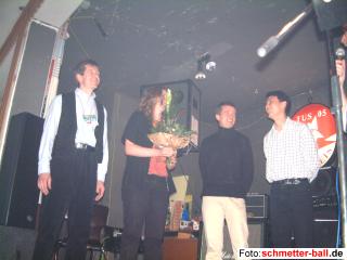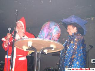 ![]() | Zur Feier selbst fanden sich 120 Personen im Kakaopalast ein, die auf der Bühne Beiträge von Gaby Kalt, Elisabeth Sobkowski, Ulli Gußmann und Martin Mehren, den Auftritt des Hl. Mannes (Kajo Miebach in Begleitung von Marie) sowie das neue Programm der Rockgruppe 'Stabilizers' geboten bekamen. Daran schloss sich eine lange Tanznacht an, zu der DJ Strothi, der freundlicherweise den erkrankten Abteilungs-DJ Hannes (einen schönen Gruß von schmetter-ball.de an Hannes in die Reha nach Bad Berleburg!) vertrat, die Scheiben auflegte. Bis um 4.00 Uhr war die Tanzfläche gefüllt und es wurden noch 50 Anwesende gezählt. Erst um 6.40 Uhr gelang es dem Chief, die letzten Unentwegten (deren Namen, da es sich immer um dieselben handelt, nicht noch einmal aufgezählt werden) aus der Lokalität zu vertreiben. Li Ang, der extra wegen der Weihnachtsfeier seinen Skiurlaub verschoben hatte, zeigte sich tänzerisch enorm verbessert und bekam von Judith gleich einen | ||||||||||||||||||||||||||||||||||||||||||||||||||||||||||||||||||||