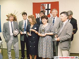 | Ins Mittelfeld, 5 Punkte vor den Absteigern, rückte das 3. Team dank eines 6:2-Sieges gegen LSG Siegerland vor. Die Siegerländer schafften ihrerseits nur hauchdünn den Klassenerhalt. Teamchef Lucht, von Bazillen befallen, erlebte den Triumph seiner Leute nur aus dem Bett mit, Björn Larsen lief als adäquater Ersatz auf. Nach den Doppeln stand es bereits 3:0 für Oberpleis. Die neu zusammengestellten Herrendoppel Larsen/Stüdemann und Chester Sobkowski/Büllesbach harmonierten überraschend gut. Einzelsiege von Larsen und Chester sowie Martina Morenzin machten den Sieg, der ausgedehnte Feierlichkeiten auslöste, perfekt. Über die Nachwirkungen solcher Feierlichkeiten wird Chester Sobkowski demnächst ein Buch veröffentlichen. | |||||||||||||||||||||||||||||||||||||||||||||||||||||||||||||||||||||