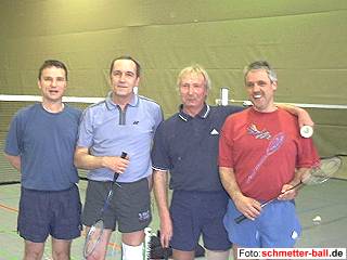| Mit einer ehrenhaften Niederlage für die Außenseiter und einem verdienten Sieg der Favoriten endete das Wett"-Spiel (um den eher bescheidenen Einsatz von einem Kasten Bier) der oben genannten Herren. In der über 60-minütigen Partie schenkten sich die Gegner keinen Ball und boten den neugierigen Zuschauern obendrein teilweise ansehnlichen Sport. HP/Chief hätten sogar beinahe die Sensation geschafft, denn im dritten Satz führten sie bereits 14:12 und hatten einen Matchball, den sie jedoch nicht verwerten konnten. Beim gemütlichen Teil nach dem Spiel beschlossen die Akteure, in den nächsten 10 Jahren, jeweils am 2. Mittwoch im April, die Tradition dieses Spiels weiterzuführen. schmetter-ball.de muss allerdings bezweifeln, ob der Chief bei | |||||||||||||||||||||||||||||||||||||||||||||||||||||||||||||||||||||