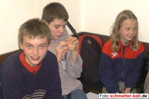 ![]() | Mit einer Glanzleistung schloss die 1. Schülermannschaft ihre Meisterschaftsrunde ab und zog damit auch insgesamt den Schlussstrich unter die Saison 2002/2003. Obwohl das Team schon als Meister feststand, wurde noch einmal toll gekämpft. Der unmittelbare Verfolger BC Wachtberg, der den Oberpleisern in der Hinrunde die einzige Saisonniederlage beigebracht hatte, musste mit einer 2:6-Niederlage im Gepäck nach Hause reisen. Einige Spiele waren hart umkämpft (1. Jungendoppel, 2. Einzel), andere (Damendoppel und Lisa Kaminski im Einzel) gingen klar an Oberpleis. Besonders erwähnen möchte der Beobachter von schmetter-ball.de die Leistung von Alina Pohl/Jannis Oelmann im Mixed. Hier lief es zunächst gar nicht gut, bis sich Jannis urplötzlich in eine Superform hineinsteigerte und am Netz unüberwindbar wurde. Vorbildlich auch der Einsatz von Hannes Hoffmann im 2. Einzel. Oberpleis hatte bereits 5 Punkte auf dem Konto, als er sein Einzel als letztes Spiel bestreiten musste. Jedem Zuschauer wurde schnell klar, | ||||||||||||||||||||||||||||||||||||||||||||||||||||||||||||||||||||