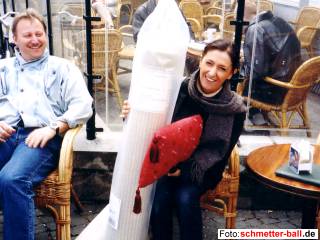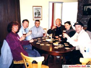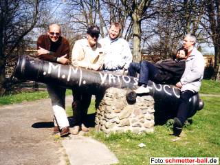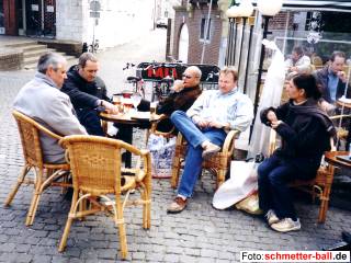 4. Team auf Mannschaftstour nach Maastricht 10.04.03 Team Nr. 4 begab sich tatsächlich in die Niederlande. Bisher gelangte von den Begebenheiten in Maastricht zwar noch nicht alles ans Licht der Öffentlichkeit, aber dass massive Probleme mit verlorenen, versteckten und zur falschen Zeit am falschen Ort befindlichen Hotel- und Zimmerschlüsseln auftraten, hörte der Spion von schmetter-ball.de aus den Erzählungen der Reisegruppe heraus. Einen groben Überblick über Teilnehmer und Verlauf der Reise vermitteln die folgenden Bilder von unserer Fotografin Gaby Kalt. | |||||||||||||||||||||||||||||||||||||||||||||||||||||||||||||||||||||