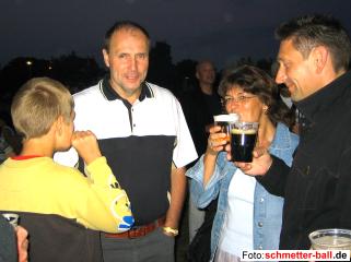 Kein Genickbruch in der Möncherei Bericht von der Markkleeberg-Reise 17.07.03 Das 21. Treffen der Badminton-Abteilungen des TuS 05 Oberpleis und des TSV 1886 Markkleeberg wurde, dank der Gastfreundschaft der Markkleeberger, zu einer runden Sache. Immerhin 11 Oberpleiser waren in den südlichen Vorort von Leipzig gereist, so viele, wie seit Silvester 1995 nicht mehr. Untergebracht waren sie in der legendären Sportlergaststätte Möncherei', wo sie nicht nur von Lutz und Sabine, sondern auch von dem kalbsgroßen neuen Hund Rocky (auf sächsisch: Roggi) begrüßt wurden. Gastwirt Lutz hat in den letzten 2 Jahren erneut bauliche Veränderungen an seinen Gästezimmern vorgenommen, die jetzt alle mit Dusche/WC ausgestattet sind, wobei die Tatsache, dass die Nasszellen nun über steile Holzleitern erklettert werden müssen, einerseits für Heiterkeit, andererseits für Besorgnis (kann das nach dem Genuss von etlichen Litern Schwarzbier noch gut gehen?) sorgte. Um es vorwegzunehmen, alle Oberpleiser sind ohne Genickbruch davongekommen. Neben dem obligatorischen Abend in der Möncherei standen eine Regatta auf der Weißen Elster', wahlweise im Ruderboot, Kajak oder Kanadier, Badminton-Vergleichskämpfe und der Besuch einer Open-Air-Disco am Cospudener See auf dem Programm. Beim traditionellen gemeinsamen Frühstück am Sonntagmorgen lud der Chief die Markkleeberger zum Gegenbesuch für den Herbst 2004 zu unserem 50-jährigen Jubiläum ein. Der Markkleeberger Sektionsleiter Jürgen Kerni' Kern kündigte daraufhin scherzhaft eine Besuchergruppe von 60-80 Personen an, wobei es unser Problem sei, diese alle unterzubringen. Nach einem Besuch der zum Kulturzentrum umgebauten ehemaligen Industrieanlage Gasometer' (mit einer interessanten Mount-Everest-Ausstellung) traten die Oberpleiser die Heimreise (mit 50 geschenkten Litern Schwarzbier im Gepäck) in der Gewissheit an, dass diese Sportlerfreundschaft noch bis zu Kernis Ableben fortgeführt werden wird. schmetter-ball.de bedankt sich ganz herzlich bei Kerni, Moni und den übrigen Markkleebergern. | |||||||||||||||||||||||||||||||||||||||||||||||||||||||||||||||||||||
