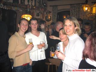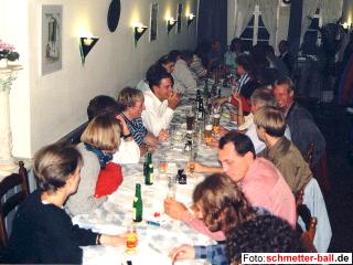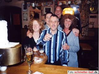 Fröhlich liefen die Spieler der 5. Mannschaft nach dem Spiel durch die Halle und versuchten dem Redakteur einzureden, sie seien nicht abgestiegen. Woher sie diese Weisheit hatten, bleibt schmetter-ball.de ein Rätsel, denn die Abschlusstabelle zeigt ein anderes Bild. Mit überraschenden 4 Punkten aus den letzten 2 Spielen zog sogar der bisherige Tabellenletzte Lülsdorf-Ranzel noch an unserer Mannschaft vorbei und stürzte TuS 5 auf den ungeliebten letzten Platz. Der 5:3-Sieg unseres Teams gegen Ruppichteroth am letzten Spieltag war also ganz nett, kam aber zu spät. Nach dem Verlust beider Herrendoppel war klar, dass das 6. Team das Ziel, den Gegner Rheidt noch vom 3. Platz zu verdrängen, nicht erreichen konnte. Das 1. Doppel Joe Quick/Chief, wegen diverser Blessuren insgesamt nur mit 3 Beinen und 3 Armen unterwegs, verpasste bei einer 16:14-Führung im ersten Satz nicht nur den Satzgewinn, sondern auch schon den Gesamtsieg, denn danach ließ die Leistung kontinuierlich nach. Placke/Mattila nutzten ihre riesige Gewinnchance ebenfalls nicht. Dass die Herreneinzel nicht der große Bringer waren, hatte man sich schon vorher gedacht. So waren es die Damen Gisela Thielmann und Judith Mertens und das Mixed Gisela/Chief, die mit ihren Siegen das Ergebnis im erträglichen Rahmen (3:5) hielten. Dem netten Gegner aus Witterschlick wollte die 7. Mannschaft nicht die Laune verderben und überreichte einen leichten 7:1-Sieg auf dem Präsentierteller. Das 2. Oberpleiser Doppel Mike Noske/Jan Morenzin hatte es mit einem 13:15, 14:15 zwar spannend gemacht und eine starke Christa Klauber spielte im Einzel 3 Sätze, es war aber, wie schon so oft, Zipf Zimmermann, der raffinierte Dauerläufer, der den Ehrenpunkt für Oberpleis holte. Teamchef Mattes machte das Vernünftigste, was man an einem solchen verkorksten Tag tun kann: Er erschien erst zu den anschließenden Feierlichkeiten. Auch wenn Jugendwart Lemmy bis kurz vor dem Spiel klagte, er hätte kein Team für das Nachholspiel der Jugend 1 gegen Pulheim, muss sich doch noch der eine oder andere Oberpleiser in die Halle verirrt haben, denn ansonsten könnte sich schmetter-ball.de den 7:1-Sieg, mit dem man das Punktekonto auf 20:0 schraubte, nicht erklären. Nähere Einzelheiten sind der Redaktion leider nicht bekannt. Letzter Spieltag 13.03.04 So schön hatte man lange nicht mehr gefeiert. Die Teams 2, 3, 6 und 7 versammelten sich nach dem Auftakt in der Halle noch im Herresbacher Bürgerzentrum, um von der Saison Abschied zu nehmen. Gäste aus Ruppichteroth und Beuel feierten ebenso kräftig mit wie Gallone und Joschi und Milka aus Düren. Sogar die vielfachen ehemaligen Deutschen Meister Evi und Karl-Heinz Zwiebler waren extra ins "Ännchen" angereist, um mit uns "3-fach kräftig schmetter-ball" zu brüllen. Und dazu gab es viele Gelegenheiten, denn die Lokalrunden flogen tief... | |||||||||||||||||||||||||||||||||||||||||||||||||||||||||||||||||||||