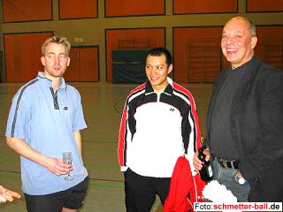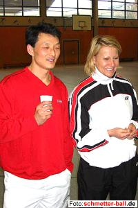 Klick 26 000 04.03.04 Die neue Bestmarke wurde am 27. Februar aufgestellt. Mehr über die Zugriffe auf schmetter-ball.de erfahren Sie hier. Bei einem aktuellen Stand von 143 zeichnet sich auch der 150. Webabend Ende April am Horizont ab. Er soll für alle Interessierten (die der Redaktion einmal beim Arbeiten hinter das Feigenblatt schauen möchten) wieder öffentlich begangen und gefeiert werden. Näheres erfahren Sie rechtzeitig auf schmetter-ball.de. Swiss Open haben begonnen 04.03.04 Endspurt im Rennen um die Olympiafahrkarten. Die Swiss Open mit einer historischen Bestbesetzung leiten die Serie der letzten 4 Grand-Prix-Turniere vor dem Qualifikationsschluss ein (es folgen All England nächste Woche, Korea Anfang April, Japan eine Woche danach). Das koreanische Mixed Kim/Ra macht sich in Basel auf die Jagd nach dem bisherigen Weltrekord der Dänen Thomas Lund/Pernille Dupont, die einmal 11 Grand-Prix-Turniere in Folge gewannen. Die Koreaner sind momentan bei 10 angelangt und könnten in der Schweiz schon einmal ausgleichen. Die deutschen Nationalspieler haben, wie schon so oft, eine bescheidene Auslosung erwischt. So traf Xu Huaiwen, die von der Spielstärke unter die letzten Acht gehört, bereits im ersten Spiel auf die Nr. 1, Gong Ruina (und wehrte sich tapfer, verlor aber in 3 Sätzen). Ähnlich ging es fast allen anderen. Björn Joppien erreichte im Herreneinzel die 2. Runde, scheiterte dann aber an einem Koreaner. Das Turnier läuft noch bis Sonntag, aktuelle Ergebnisse finden Sie hier. | |||||||||||||||||||||||||||||||||||||||||||||||||||||||||||||||||||||