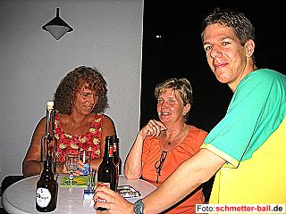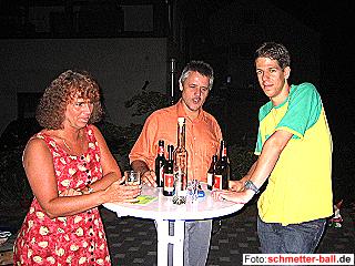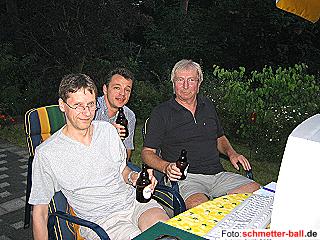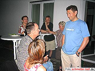 3 Jahre schmetter-ball.de 160. Sitzung der Redaktion 30.07.04 Die Redakteure trafen sich am 30.07. mitsamt ihren besseren Hälften, die sicherlich insgeheim wegen der häufigen Abwesenheit ihrer Männer schon etliche Flüche zum Himmel geschickt haben, zur 160. Redaktionssitzung. Gleichzeitig wurde der 3. Geburtstag von schmetter-ball.de gefeiert, das tatsächliche Geburtsdatum ist, wie bekannt, der 24.07.2001. Einige Gäste hatten das Angebot zum Mitfeiern angenommen und schauten den Redakteuren interessiert bei der Arbeit zu, denn eine neue Ausgabe von schmetter-ball.de musste nebenbei natürlich auch auf die Beine gestellt werden. | |||||||||||||||||||||||||||||||||||||||||||||||||||||||||||||||||||||
