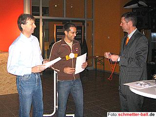 | Bürgermeister Wirtz ehrt die Markleeberger Andreas Einbock und Reiner Fenske | Die Überraschungssieger Herren B, Knacker und Mehri, bei der Siegerehrung | ||||||||||||||||||||||||||||||||||||||||||||||||||||||||||||||||||||
