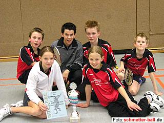 Am 06.03.2005 wurde in Leverkusen zum zweiten Mal der Alexander-Hecker-Bezirkspokal ausgespielt. Teilnahmeberechtigt waren die Sieger der Schüler- und Jugendnormalklassen. Da die Mädchen unserer Jugend II für dieses Wochenende bereits anderweitig gebucht waren, musste die Jugendmannschaft schweren Herzens auf ihren Einsatz verzichten. Recht optimistisch ging dagegen Martins Schülermannschaft an den Start, denn die Ausschreibung dieses Mannschaftsturniers mit nur 5 Paarungen (JE, ME, JD, MD, MX) kam unserem Team mit den starken Mädchen (Hannah Pohl, Kristin Schönherr) sehr entgegen. In der Vorrunde besiegte man in den Gruppenspielen zunächst Kreuzau mit 4:1, danach Lützenkirchen mit dem gleichen Ergebnis. Im Endspiel traf Oberpleis auf das Team von Refrath, das sich in der anderen Gruppe durchgesetzt hatte. Auch in diesem Spiel siegte unsere Schülermannschaft mit 4:1, wobei Philip Otzipka sein | ||||||||||||||||||||||||||||||||||||||||||||||||||||||||||||||||||||
