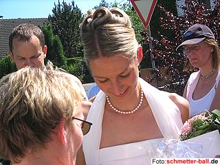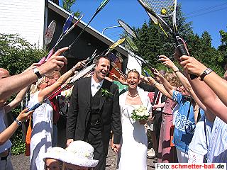 Mit einem beeindruckenden Schlägerspalier empfing die Badmintonabteilung Martina Gust und Markus Runald nach ihrer kirchlichen Trauung vor der Kapelle in Uthweiler. Bei herrlichem Sonnenschein war die strahlende Braut natürlich der umjubelte Mittelpunkt des Geschehens, während der Bräutigam eher nachdenklich wohl gerade realisierte, dass er soeben seine Freiheit für immer verloren hatte. schmetter-ball.de und die Badmintongemeinde wünschen dem Paar jedenfalls viel Glück und alles Gute für die Zukunft. Nach der jahre-, fast jahrzehntelangen Probezeit sollte eigentlich nicht mehr viel schief gehen. | |||||||||||||||||||||||||||||||||||||||||||||||||||||||||||||||||||||