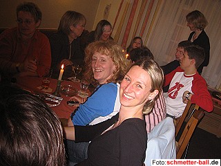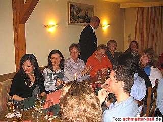 Hannah traf im 1. Spiel auf Jana Mlada (Tschechien) und behauptete sich mit 11:6 11:6. Keine Chance gab es dagegen in der 2. Partie gegen Laura Tyberghein (Frankreich). 1:11, 3:11 war das klare Ergebnis. Als Gruppenzweite erreichte Hannah die K.O.-Runde der letzten 16. Hier war die 1. Gegnerin Aphrodite Christodoulou aus Zypern. Mit 6:11, 11:7, 3:11 endete der Länderkampf Eisbach gegen Zypern und Hannah war leider ausgeschieden. Wer noch mehr über das Turnier erfahren möchte, kann das unter http://www.olvebadminton.be nachlesen. Après Spiel Na also, es geht noch! 19.04.06 Was im Laufe der Saison kaum einmal gelungen war, konnte nach dem letzten Spieltag doch noch einmal realisiert werden, ein gemütliches Treffen der Aktiven und Freunde im Wirtshaus. Es war sicherlich taktisch richtig, den Ort des Geschehens wieder mitten ins Dorf zu verlegen. So kehrte man zurück in den 'Alten Zoll', wo Generationen von Oberpleiser Federballern ihr Vermögen und ihren Verstand zumindest in höchste Gefahr gebracht haben. Die in dieser Hinsicht, wie immer, vorbildlichen Freunde aus Ruppichteroth komplettierten die lange Tafelrunde. Mitten in der Nacht ließen die unzerstörbaren letzten Gäste dann auch den alten Brauch des Eierbackens wieder aufleben, wozu Monivize nach Eisbach eingeladen hatte. Gut, dass der Osterhase gerade eine frische Ladung Eier im Hause Pohl deponiert hatte... | |||||||||||||||||||||||||||||||||||||||||||||||||||||||||||||||||||||