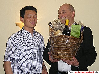 Abschied von Ang in 2 Etappen 19.04.06 Wie es sich gehört, wurde Li Ang von der Abteilung und ihren maßgeblichen Leuten gebührend verabschiedet. Die große Runde, die sich am letzten Spieltag versammelt hatte, bot einen würdigen Rahmen für die Überreichung eines Abschiedsgeschenks durch den Abteilungsleiter, der Ang auch den Dank der Abteilung für alles, was dieser in den letzten 8 Jahren für uns geleistet hat, übermittelte. Am Gründonnerstag machte sich dann eine siebenköpfige Oberpleiser Delegation auf nach Düsseldorf, Angs Wahlheimat. Zusammen suchte man zunächst ein chinesisches Lokal auf, das Ang ausgesucht hatte (ein 'richtiger' Chinese, kein Chinese für Deutsche, wie Ang betonte) und traute sich auch an traditionelle chinesische Speisen, die man sonst nicht ohne weiteres bekommt. Fasziniert lauschte man Angs Erzählungen aus der großen Badminton-Welt, so der Geschichte, wie er zusammen mit dem Headcoach des chinesischen Nationalteams, Li Yongbo, am Finaltag der German Open bis 16:00 Uhr im Wirtshaus hockte (Spielbeginn der Endspiele war um 12:00 Uhr), aber die ersten 4 Spiele waren Spiele von Chinesen gegen Chinesen, und was sollte der Headcoach da schon sehen, was er nicht schon längst wusste? Die letzten Stunden des Zusammenseins verbrachten Ang und die Oberpleiser dann in einem privaten chinesischen Club, in dem Ang seiner zweiten Leidenschaft, dem Karaoke-Singen frönen konnte (und als einziger Sänger des Abends rauschenden Beifall bekam). Die Oberpleiser, zum Mitmachen aufgerufen, trauten sich zwar, gaben aber wohl eine so jämmerliche Vorstellung ab, dass die übrigen Gäste fluchtartig den Club verließen. Immerhin war die Oberpleiser Delegation froh zu hören, dass Ang sich in Oberpleis wohlgefühlt hat und dass er in seiner ganzen Karriere nirgendwo so viel Spaß gehabt hat, wie auf unseren Feiern. Er versprach, dass er, wenn er einmal sein Geld nicht mehr mit Badminton verdienen muss, gerne wieder nach Oberpleis zurückkommen wird (vermutlich ist er dann 65 und wäre natürlich immer noch unsere Nummer 1). Auf Wiedersehen, Li Ang! | |||||||||||||||||||||||||||||||||||||||||||||||||||||||||||||||||||||