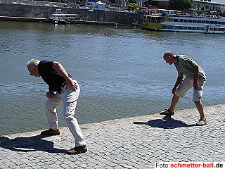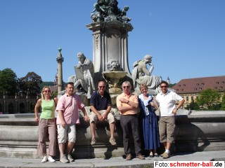 Mannschaftstour 5. Team nach Würzburg 15.09.06 Nach stockender Anreise traf das (letztjährige) 5. Team am 14. Juli bei Sonnenbrandwetter im Frankenland ein und absolvierte bis zum 16. (Sonntag) ein umfangreiches Kulturprogramm, bei dem die Geselligkeit nicht zu kurz kam. Zunächst zu viert, ab Samstagmittag zu sechst, streifte man ausschließlich zu Fuß durch die wunderschöne Stadt und besichtigte den Kulturspeicher, die Mainpromenade mit dem Alten Kranen, die Burganlage Marienburg und die Residenz mit dem größten zusammenhängenden Deckengemälde der Welt. Für Hennes war die Würstchenbude, die er vor etlichen Jahren auf der Durchreise entdeckt hatte, natürlich genau so wichtig. Da sich sämtliche Damen und Herren des Teams bereits im fortgeschrittenen Alter befinden, ließ man den Samstagabend auf einer Ü-45-Party ausklingen. | |||||||||||||||||||||||||||||||||||||||||||||||||||||||||||||||||||||