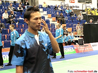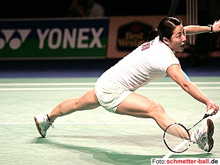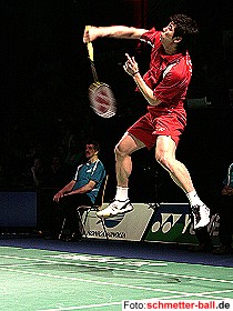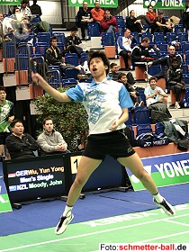 Durch die Einführung der neuen Turnierserie 'Super Series' mit jährlich 12 Top-Turnieren (8 in Asien, 4 in Europa), dotiert mit jeweils 200 000 Dollar Preisgeld, sind die German Open (Dotierung 80 000 Dollar) von der Bedeutung her in die 2. Reihe gerückt. Von daher konnte man mit der Qualität des Teilnehmerfeldes bei den diesjährigen, den 50., German Open vom 27.02. -04.03.07 in Mülheim/Ruhr sehr zufrieden sein. Auch wenn etliche der absoluten Topspieler fehlten, fanden noch genügend hochkarätige Spielerinnen und Spieler den Weg nach Mülheim und vor allen Dingen viele junge Spieler nutzten die Chance, um auf sich aufmerksam zu machen. Wie im Vorjahr gingen 4 Titel an China und einer an Korea. Die Chinesen, denen es anscheinend in Deutschland gefällt, stellten ein großes Teilnehmerkontingent und hatten mit Weltmeister Dan Lin und Weltmeisterin Xingfang Xie auch ihre Superstars mitgebracht. Die vermutlich beste Doppelspielerin der Welt, Ling Gao, trat im Mixed mit ihrem neuen Partner Bo Zheng an. Hier haben die Trainer offensichtlich den zuletzt erfolglosen, knubbeligen Jun Zhang ausgemustert. Lin, Xie und Zheng/Gao wurden Turniersieger, wobei im Endspiel des Dameneinzels die Deutsche Meisterin Huaiwen Xu gegen Xie eine große Partie lieferte und, anders als im Halbfinale von Madrid, wo sie nicht die Spur einer Chance hatte, nur knapp unterlag. Die Redakteure von schmetter-ball.de nutzten traditionell den Tag der Achtelfinale, um sich Weltklasse-Badminton anzusehen und kamen auf ihre Kosten, wobei Bildredakteur Tom ca. 1000 Fotos machte und der Chief das Auftreten von einigen seiner Lieblingsspieler bewunderte. Dan Lin zuzuschauen ist immer ein Erlebnis, auch wenn er, wie schon mehrmals gesehen, seine Gegner gerne mitspielen lässt und sich damit, gerade durch das neue Zählsystem, in Gefahr begibt. Koreas große Hoffnung in den Doppelwettbewerben, der 18-jährige Jugendweltmeister Yong Dae Lee, im Herrendoppel bei den Großen bereits bestens akklimatisiert, belegte in diesem Jahr Platz 2, nachdem der das Turnier im Vorjahr sogar schon gewonnen hatte. Es gab ein Wiedersehen mit dem wieder erstarkten Malaysier Wong Choong Hann, der die schmetter-ball.de-Redakteure seit dem Gründungsjahr 2001 begleitet, man sah erstmals Sigit Budiarto, den genialen Doppelspieler aus Indonesien, der nun, auf der Zielgerade seiner Karriere, erkennbar nicht mehr gerne schnell über das Feld eilt, aber Schläge draufhat, bei denen man nicht nur als Gegner die Ohren anlegt.Mit dem legendären Ha Tae Kwon, der nun die erfolgreichen koreanischen Doppel coacht, konnte man sich über deren Erfolge freuen. Besonders aufmerksam verfolgte man schließlich das Abschneiden des Chinesen Yun Yong Wu, der bekanntlich auch schon für den TuS Oberpleis gespielt hat. Er trumpfte groß auf und kam bis ins Halbfinale, wo er gegen den Weltranglistensiebten Chen Yu im ersten Satz bis 16:16 absolut gleichwertig war und erst durch eine Verletzung, die ihn schließlich im 2. Satz zur Aufgabe zwang, gestoppt wurde. Ohne eigenes Zutun wurde Yun Yong übrigens Teil einer selten erlebten Posse, denn die Organisatoren erklärten ihn nach dem Ausscheiden des letzten deutschen Teilnehmers im Herreneinzel flugs zum Deutschen und er spielte am Donnerstag 2 Runden unter deutscher Fahne, ehe er ab Freitag dann still und heimlich wieder als Chinese geführt wurde. Chen seinerseits trat zum Finale nicht mehr an, weil er sich beim Aufwärmen am Finaltag verletzte. | |||||||||||||||||||||||||||||||||||||||||||||||||||||||||||||||||||||